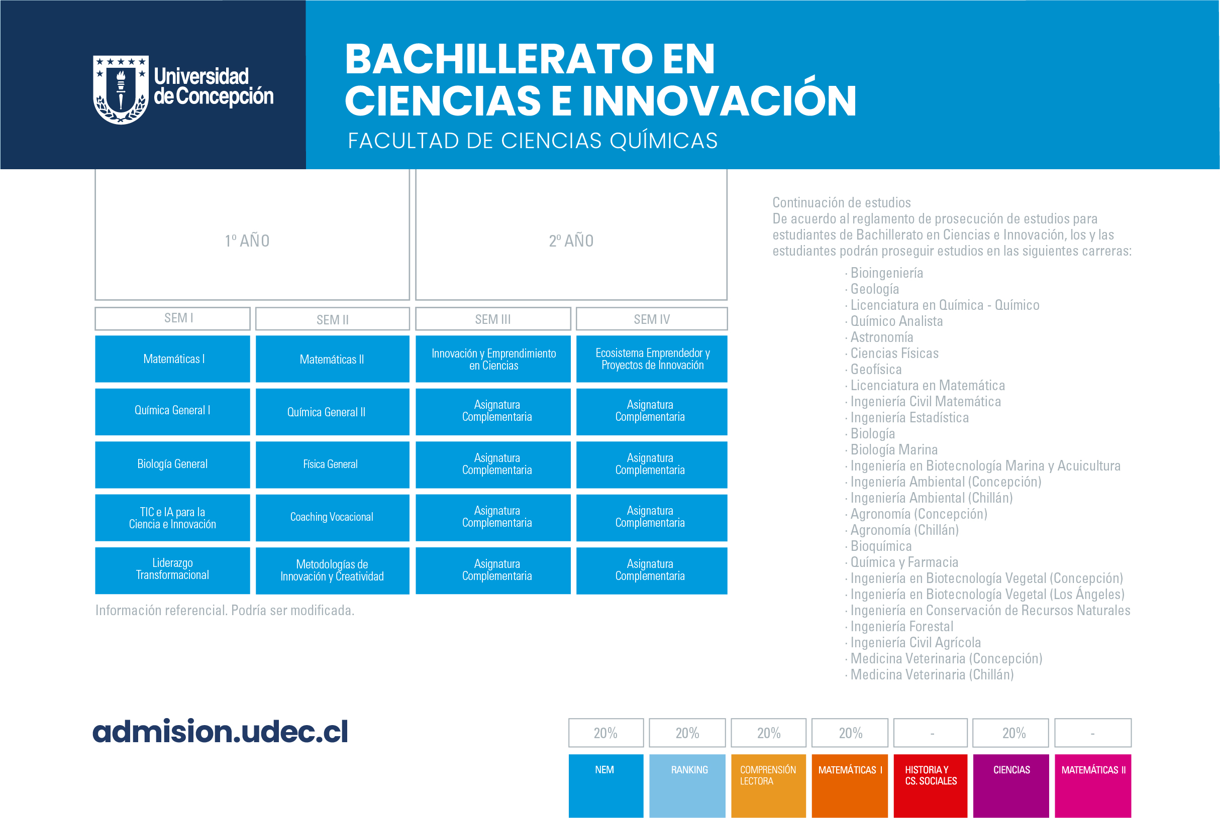 Los y las estudiantes que hayan cursado y aprobado el primer año del plan de estudios del Bachillerato en Ciencias e Innovación podrán postular para continuar sus estudios en alguna de las 26 carreras que conforman el consorcio de Facultades de Ciencias de la Universidad de Concepción, según el orden de sus preferencias. Esta postulación estará sujeta a un proceso de selección interna.