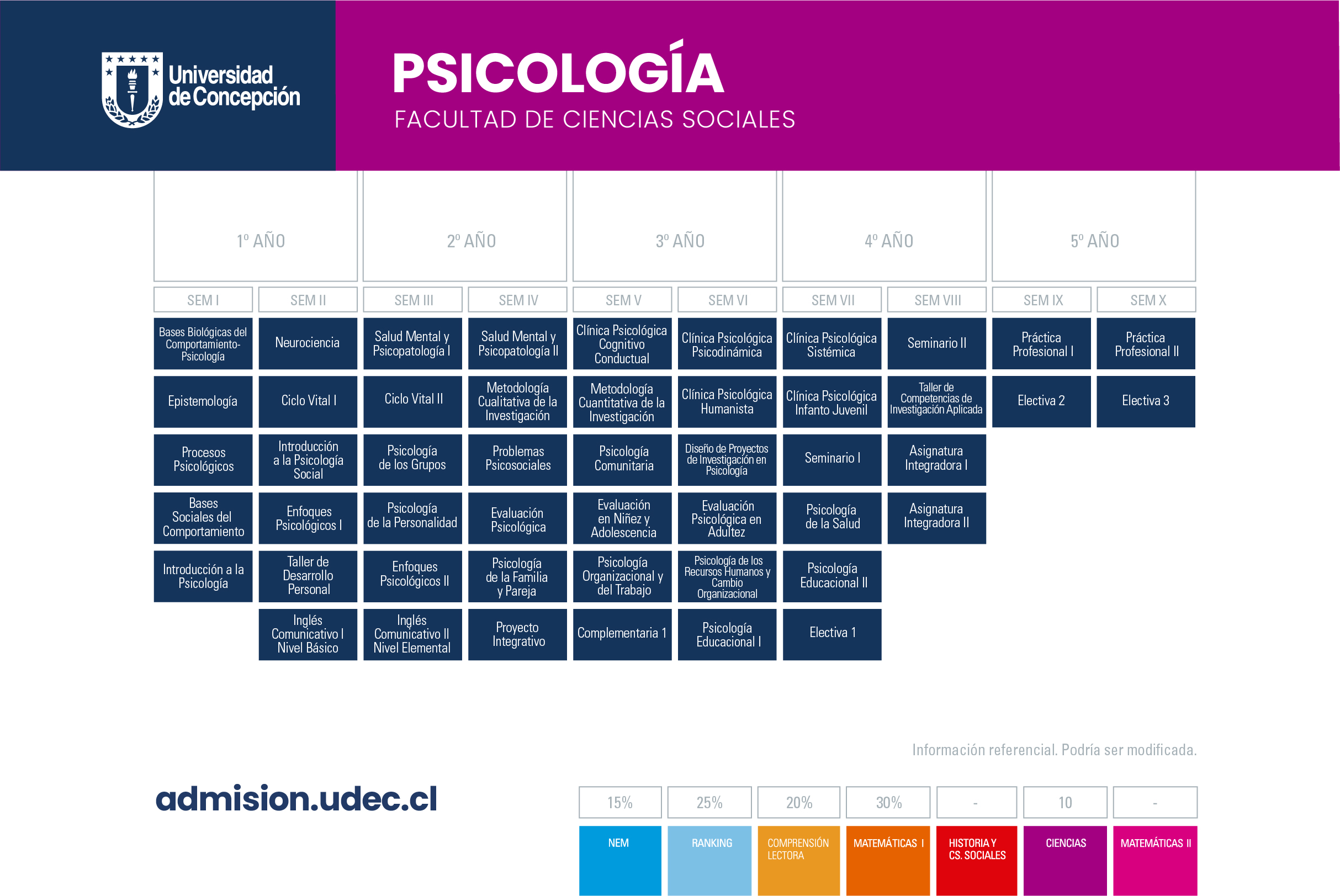 La carrera de Psicología de la Universidad de Concepción está orientada a formar profesionales integrales, asegurando en el proceso la creación de un ambiente que favorezca el aprender a conocer, el aprender a hacer, el aprender a vivir juntos y el aprender a ser, en concordancia con los principios difundidos por la UNESCO. Su objetivo es el desarrollo de profesionales con una sólida comprensión de las características y modos de influencia de los distintos determinantes del comportamiento humano, capaz de desarrollar una perspectiva integradora y compleja de la diversidad de conductas humanas; de contextualizar procesos psicosociales, teorías y modelos explicativos; de aplicar metodologías científicas; de organizar información conceptual y empírica; de establecer relaciones de retroalimentación entre teoría y práctica, y de favorecer procesos de transformación, tanto individual como social, que promuevan una mejor calidad de vida en las personas y sus comunidades. Estas capacidades serán puestas en práctica a través del desarrollo de las competencias necesarias para evaluar e intervenir en los principales campos aplicados de la psicología. La formación profesional busca que los/as estudiantes sean inquisitivos/as frente a su medio y alienta la actualización permanente, lo que favorece la continuación de estudios de post grado.